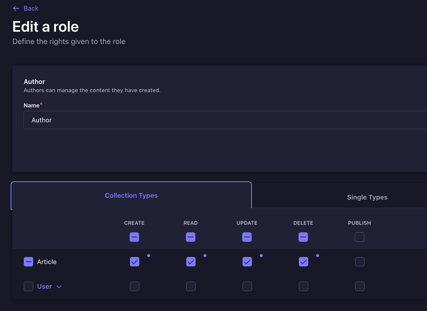 Même si notre client n’avait pas immédiatement besoin d’une gestion fine des droits, Strapi propose un système complet de rôles et permissions.